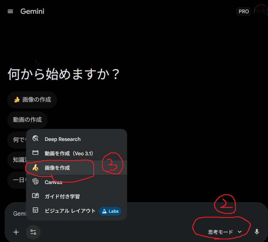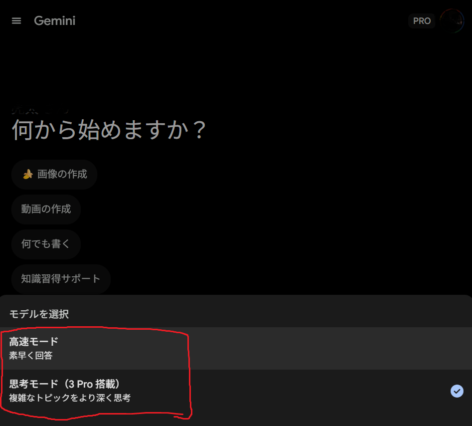 Gemini 3には「高速モード」と「思考モード」の2つのモードがあります。モードを選択する手順は下記の通りです。